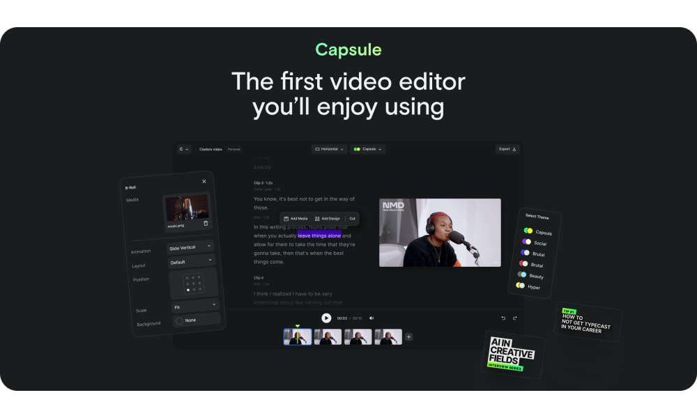 Say hello to Capsule, your new AI-powered video editing sidekick. It'll make your video editing a breeze with amazing motion graphics, and you'll speed up your workflow by a whoppi..